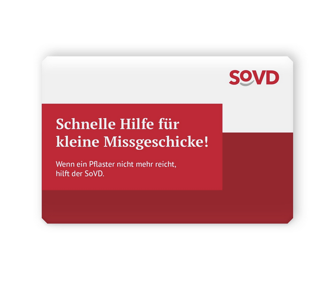 - Werbebotschaft auf der Verpackung: „Schnelle Hilfe für kleine Missgeschicke! Wenn ein Pflaster nicht reicht, hilft der SoVD.“